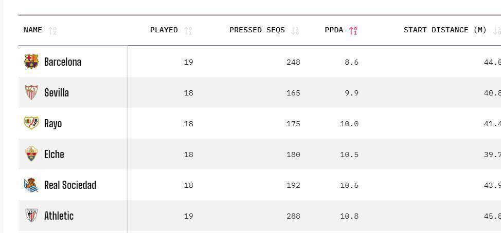 再看巴萨这边,嘿,人家这赛季玩的就是高压迫。 有个专业数据叫PPDA,数值越低说明压迫越狠,巴萨这赛季在西甲这方面是独一档。